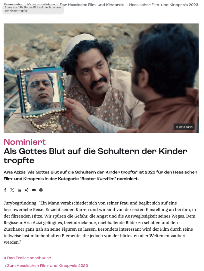 EN: “Gods Blood” Afghanistan, the last days before the takeover of the Taliban. The fruit seller Assil meets an injured soldier on his way through the desert. If Assil does not take the wounded man with him, the wounded man will die. If Assil takes him and is stopped by the wrong troops, he himself will be killed.
